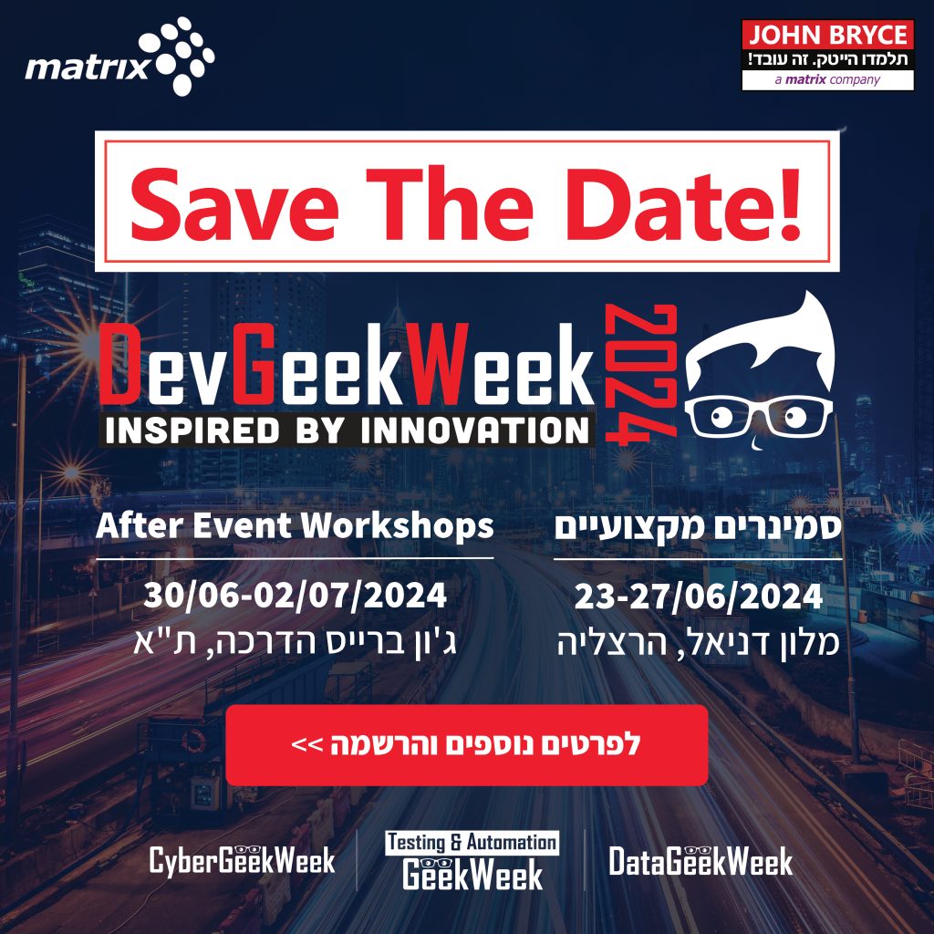 DevGeekWeek, the leading event in the high-tech sector in Israel, is the place where the brightest minds in development, engineering, software architecture, and the spectrum of technological leadership gather to explore the frontier of technology. This unprecedented gathering is a beacon for those eager to dive into the latest technological innovations, offering a unique opportunity for attendees to increase their expertise or gain a basic understanding of a broad spectrum of developer technologies, languages, platforms, and tools. לפרטים נוספים על הכנס